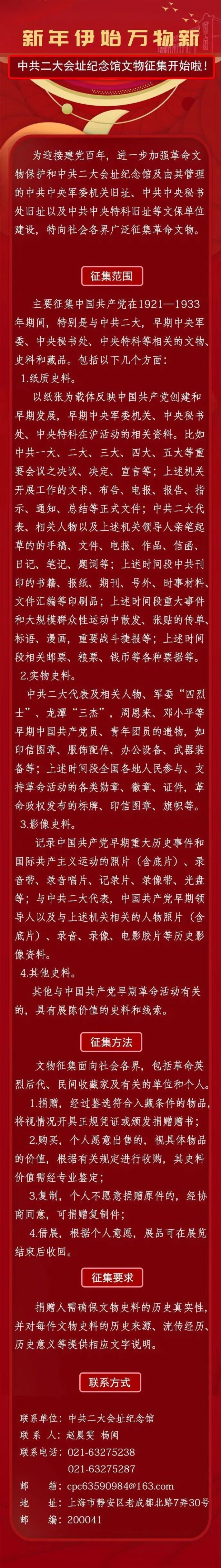 中共二大会址纪念馆 文物征集开始啦! 如果你有中国共产党 在1921-1933年期间, 特别是与中共二大, 早期中央军委、中央秘书处、 中央特科等相关的 文物、史料和藏品, (纸质史料、实物史料、影像史料、其他史料) 请一定看下去! 来源:中共二大会址纪念馆微信公众号 编辑:史笑雨