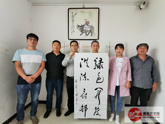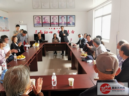 两位首长与藏品艺术网、将士丰采书画院艺术家们向老区村捐赠书画作品和慰问品