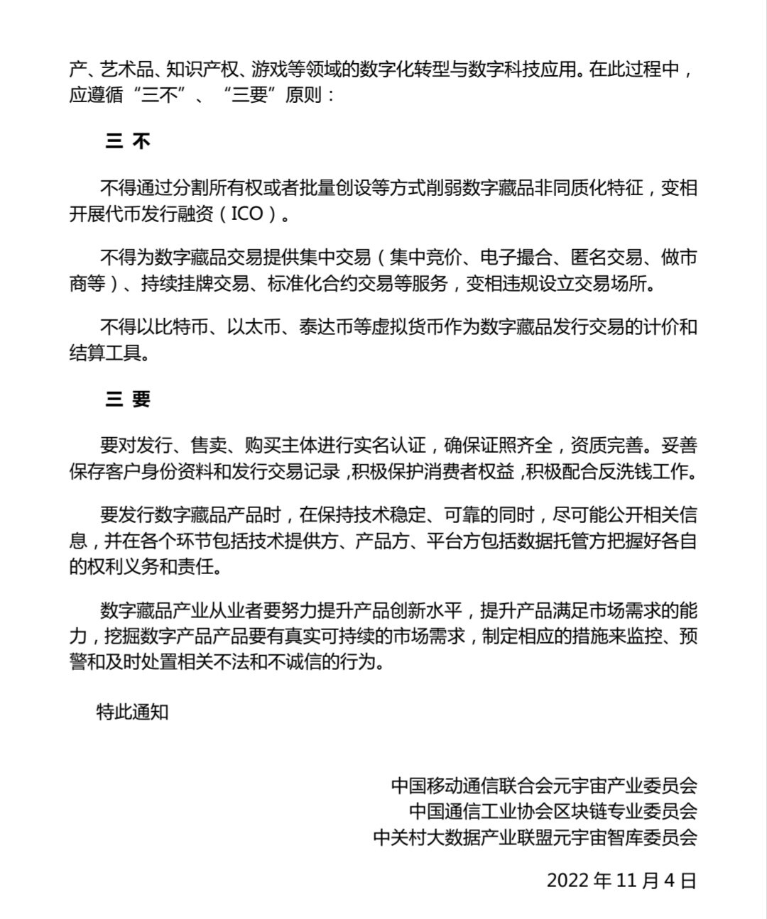 近日来多地金融监管部门陆续发文,提醒公众要警惕打着数字藏品、元宇宙旗号的非法行为。11月4日,中国移动通信联合会元宇宙产业委员会、中国通信工业协会区块链专业委员会中关村大数据产业联盟元宇宙智库委员会联合印发了《关于鼓励数字藏品发展和第三次自律规范的通知》,提出“三不”“三要”原则,再次为元宇宙发展提供行业规范。