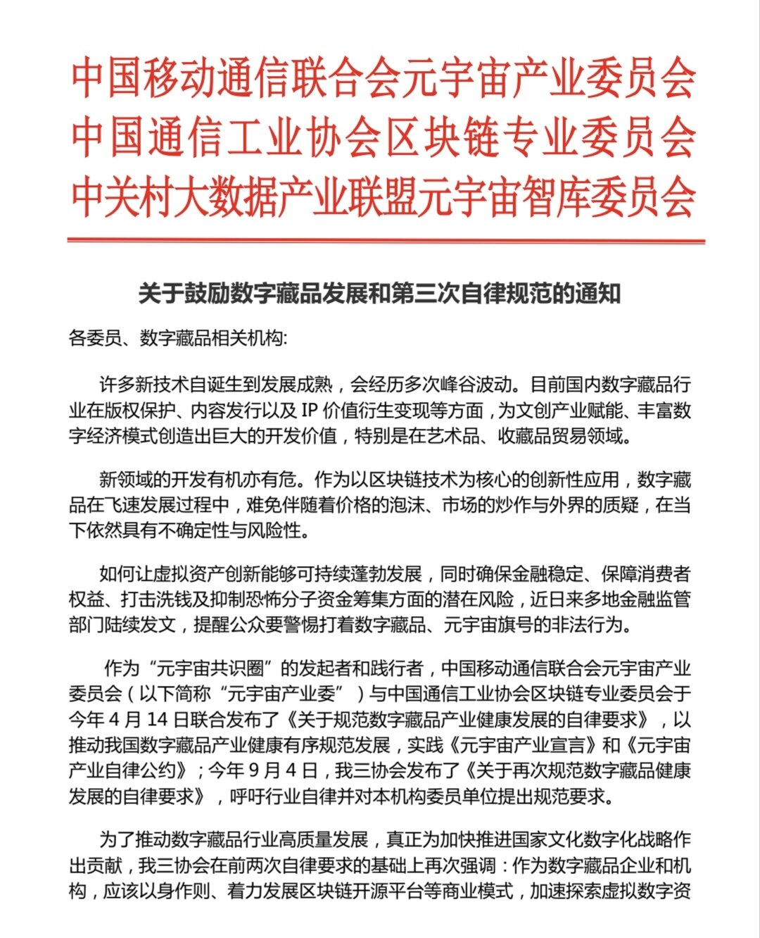 如何让虚拟资产创新能够可持续蓬勃发展,同时确保金融稳定、保障消费者权益、打击洗钱及抑制恐怖分子资金筹集方面的潜在风险,作为“元宇宙共识圈”的发起者和践行者,中国移动通信联合会元宇宙产业委员会与中国通信工业协会区块链专业委员会于今年4月14日联合发布了《关于规范数字藏品产业健康发展的自律要求》,以推动我国数字藏品产业健康有序规范发展,实践《元宇宙产业宣言》和《元宇宙产业自律公约》;今年9月4日,三协会发布了《关于再次规范数字藏品健康发展的自律要求》,呼吁行业自律并对本机构委员单位提出规范要求。