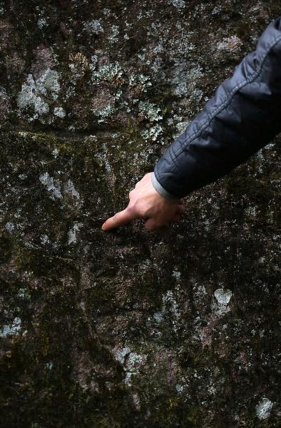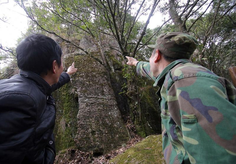 “雕刻的字像是草书,但无法分辨是什么字,字体也不清晰。” 随行的上山分场场长谢意太告诉记者。