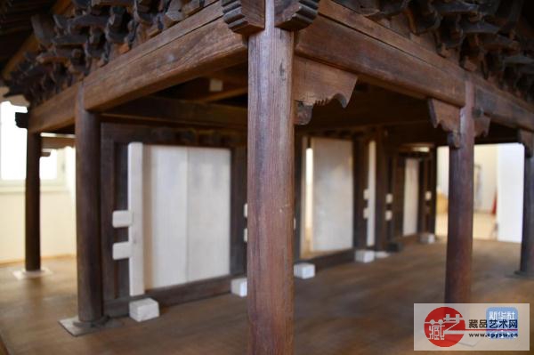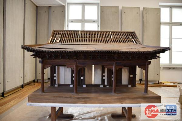 这是11月6日在斯洛文尼亚卢布尔雅那的民族志博物馆拍摄的修复完成的中国古建筑木质大门模型。