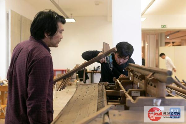 10月16日,在斯洛文尼亚卢布尔雅那的民族志博物馆,故宫博物院专家鲍杰(左)和史孙明修复中国古建筑木质大门模型。