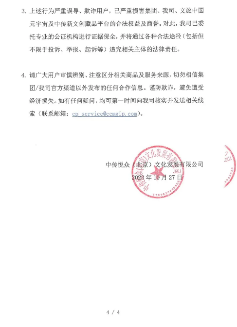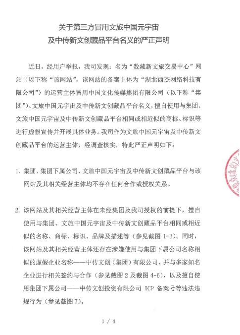 新闻链接:《关于第三方冒用文旅中国元宇宙及中传新文创藏品平台名义的严正声明》