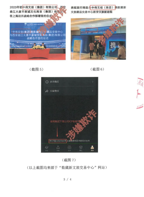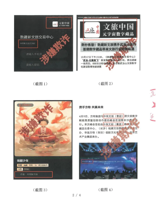 2023年10月26日,中传悦众(北京)文化发展有限公司(以下简称“中传悦众”)接到用户举报,发现名为“数藏新文旅交易中心”的运营主体冒用中国文化传媒集团有限公司、文旅中国元宇宙及中国文化传媒新文创藏品平台名义、商标、标识等进行虚假宣传并实施诈骗。为避免广大消费者遭受经济损失,中传悦众维权部经过判定,迅速对该违法情形进行了证据保全,于2023年12月向湖北省公安厅递交报案材料。