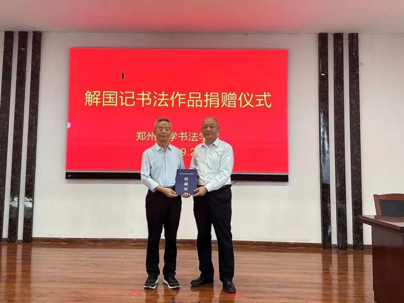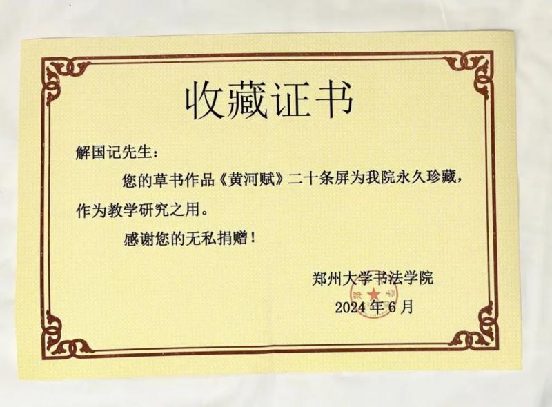 郑州大学原纪委书记、书法学院硕士生导师许东升教授向解国记颁发了收藏证书。