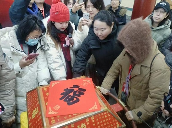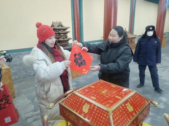 “一二三,按!”四名游客从四个方向一起按下带着龙形装饰的把手,一张印制在先农坛定制宣纸上的“福”字就这样印成了。在春节期间,先农坛将为游客免费赠送福字。