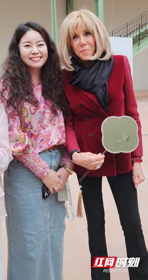法国总统马克龙夫人布丽吉特·马克龙(Brigitte Macron)现身刘雅的湘绣展区。