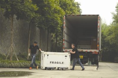 押运员将文物从车上卸下运往三星堆文物库房 昨日上午,三星堆博物馆内,来自中国社科院考古研究所、湖北省博物馆、湖南省博物馆、殷墟博物馆、武汉盘龙城遗址博物馆、长沙市博物馆、岳阳市博物馆、成都金沙遗址博物馆共8家文博单位的国宝陆续与大家见面。