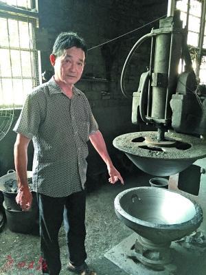 汪金元和同事每天凌晨4时就进铸锅房,一直忙到近中午。他们将铁水倒进压模机,在气压的作用下,铁水5秒钟就变成通体透红、冒着热气的铁锅。而后熟练的工人用钳子夹出铁锅晾凉、打磨、抛光、检查质量。在砂轮机刺耳的摩擦声里,一口口生铁锅“诞生”了。
