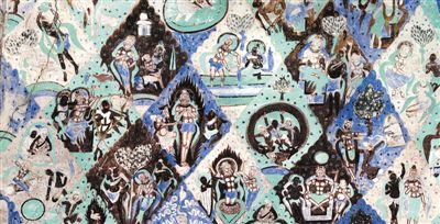 克孜尔石窟第17号窟券顶的菱形格本生故事画。