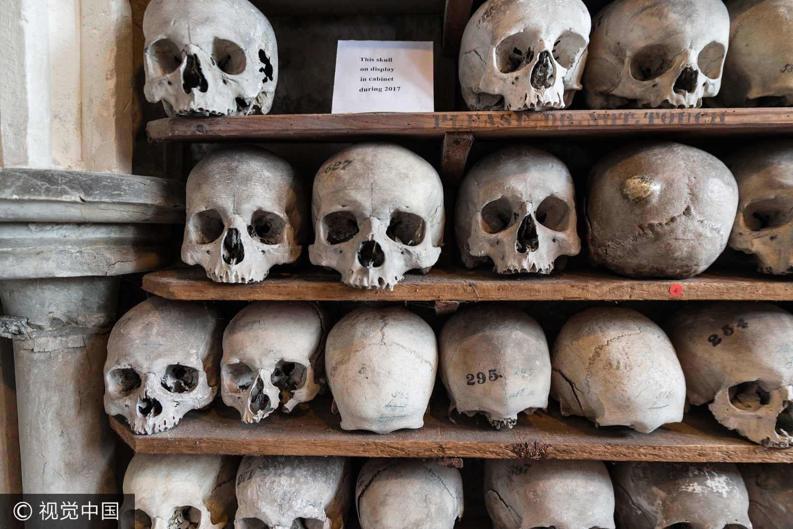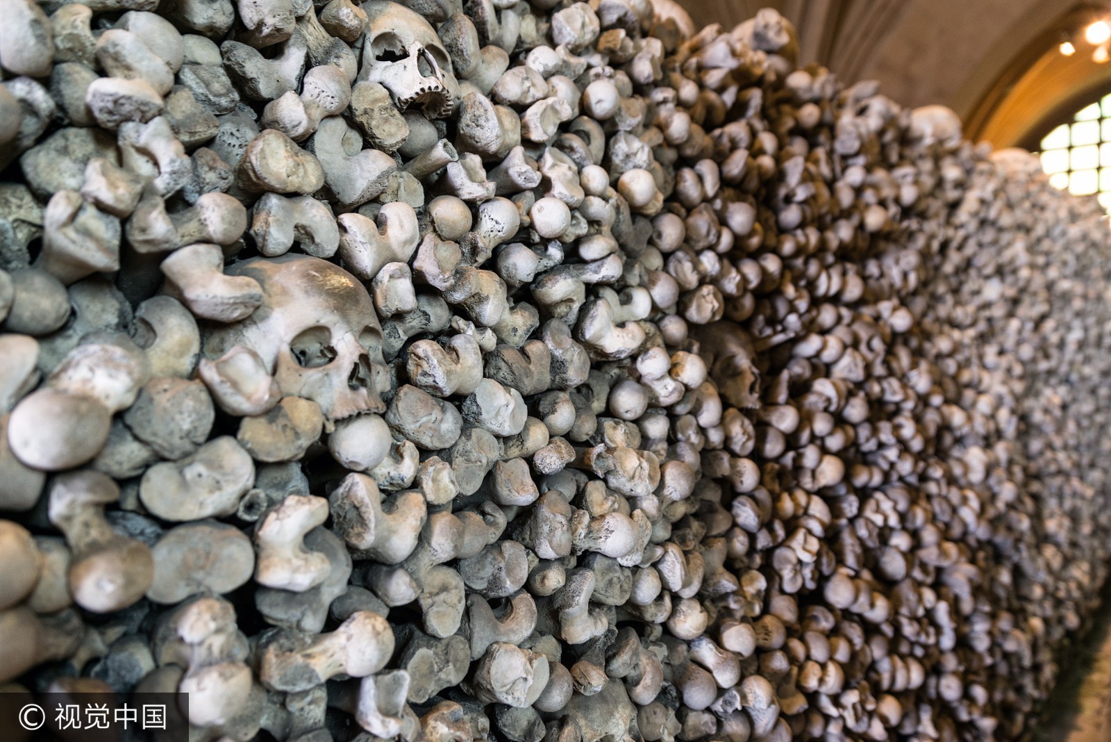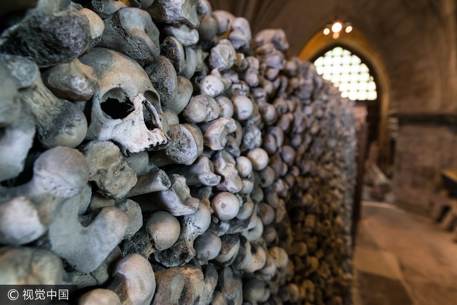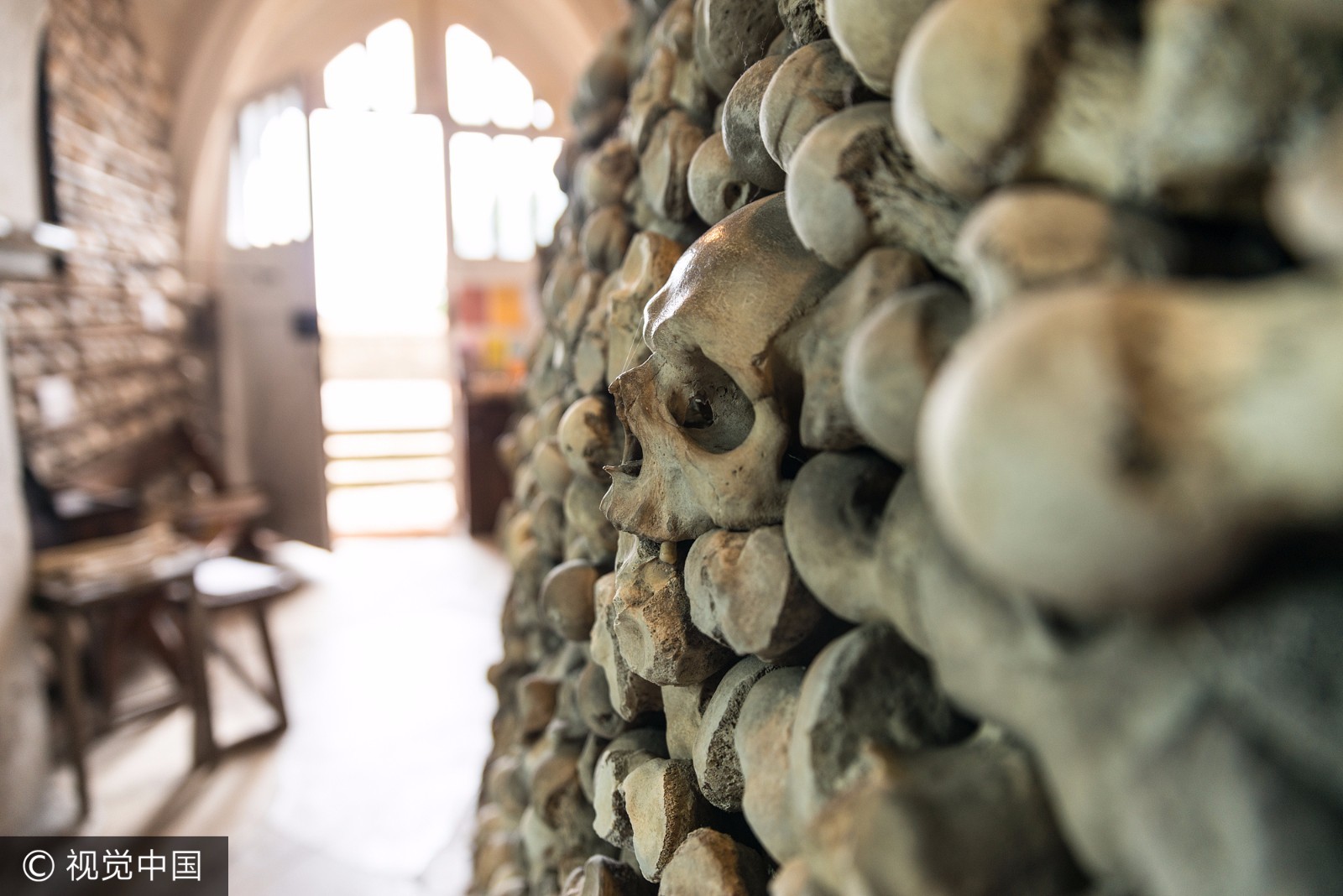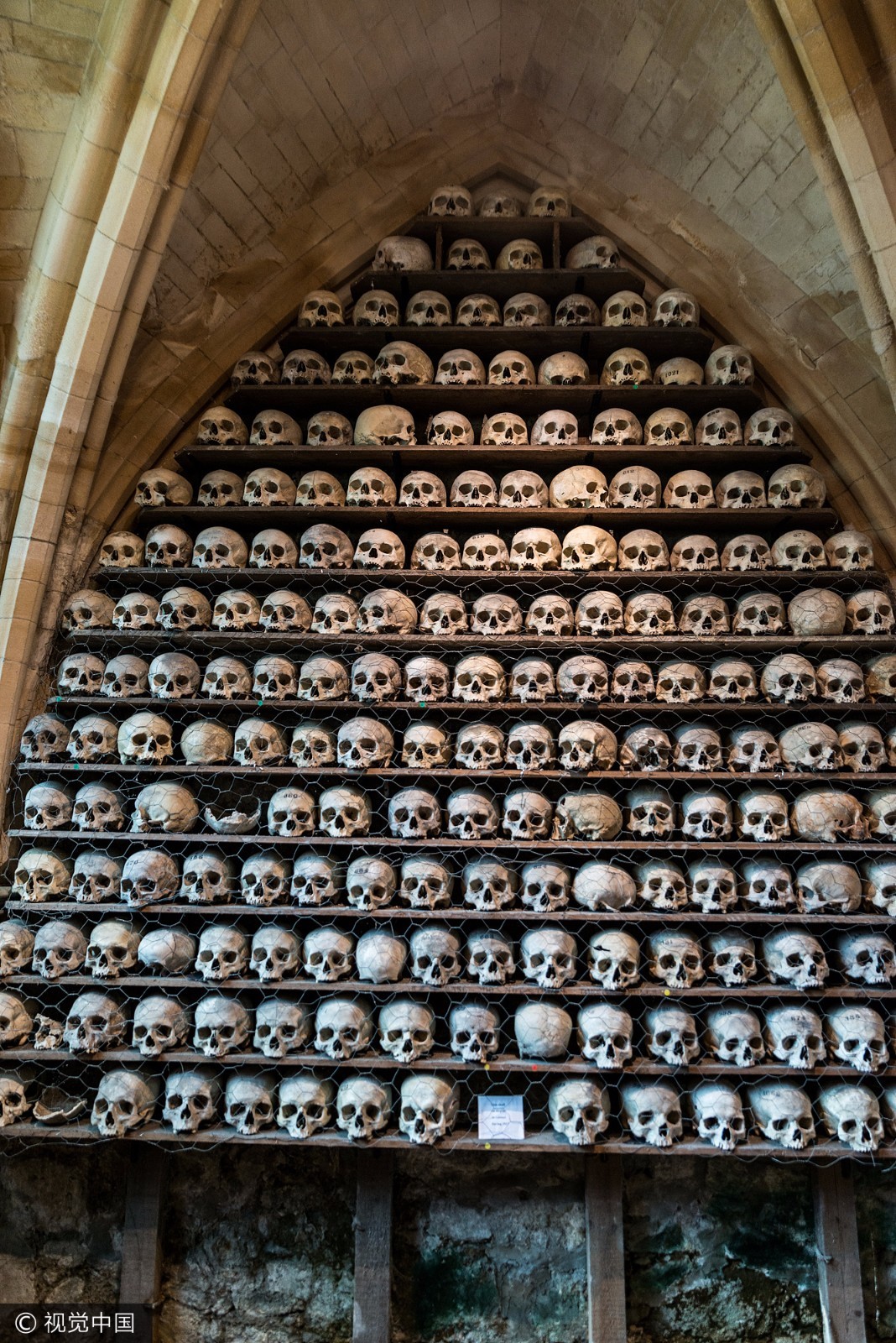 当地时间2017年6月,英国肯特郡海斯,圣伦纳德教堂内白骨森森。 圣伦纳德教堂收藏有英国数量最大、保存最完善的人类遗骨。 一千多个头骨整齐排列在4个拱洞中,而每一个拱洞头骨的高度都超过了1.8米。