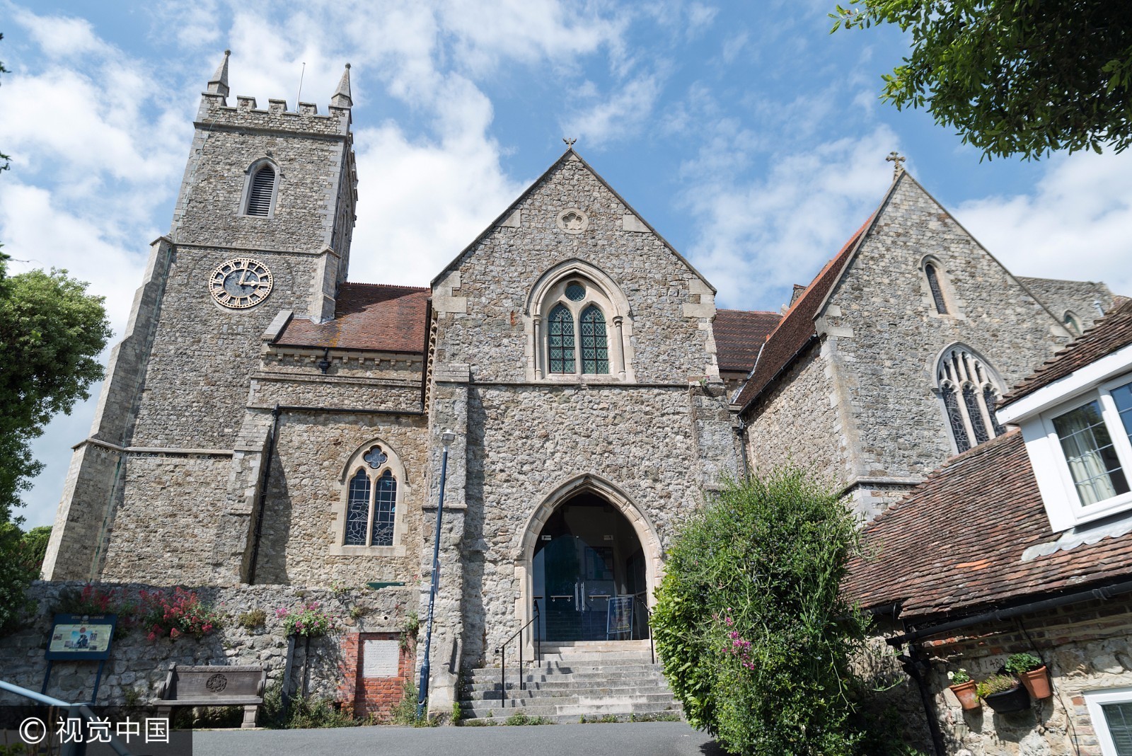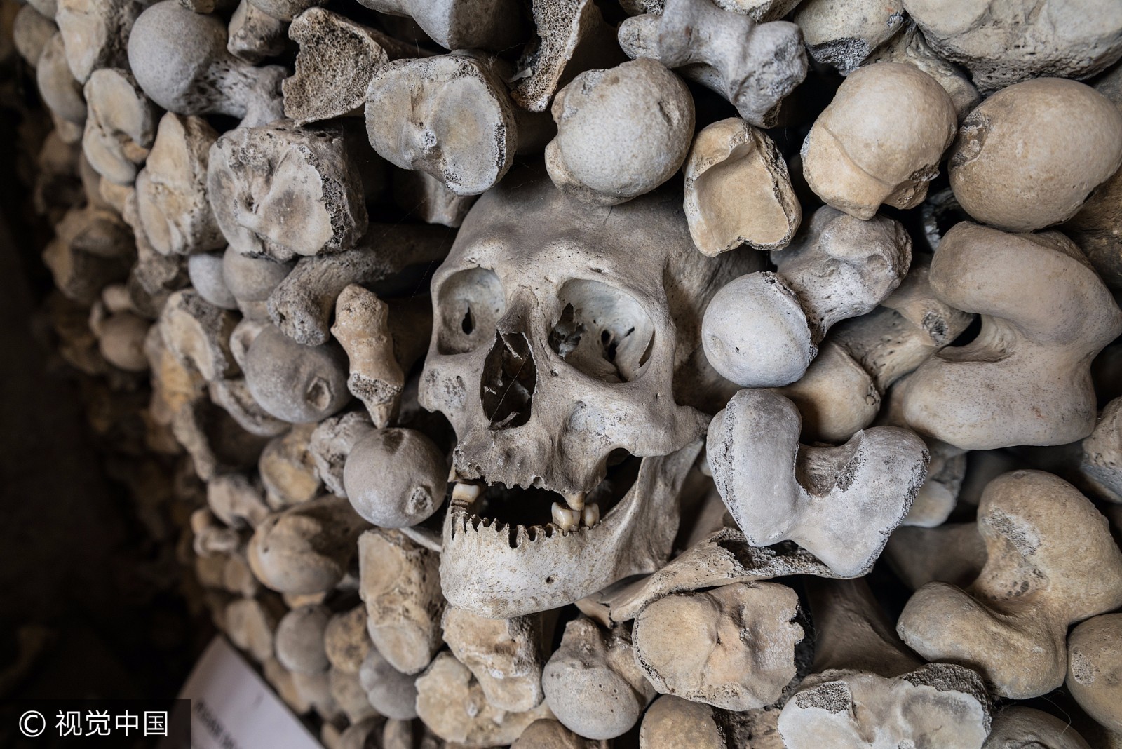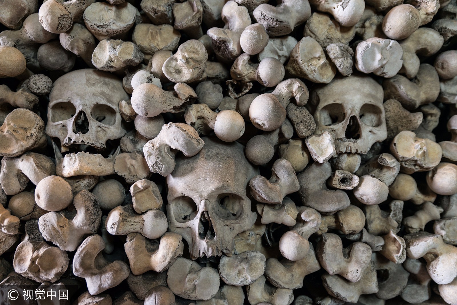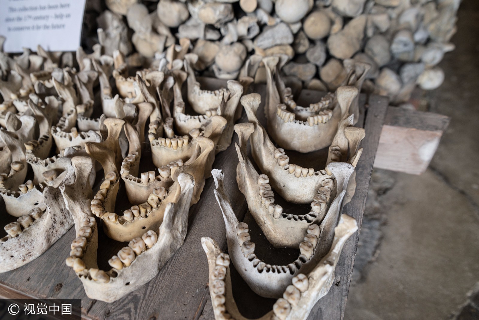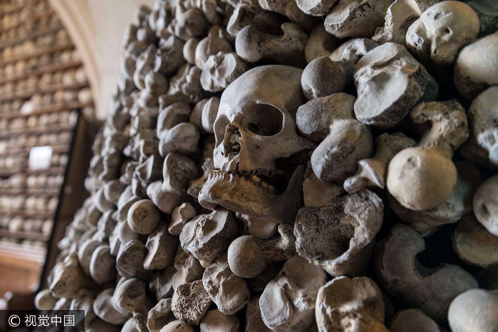当地时间2017年6月,英国肯特郡海斯,圣伦纳德教堂内白骨森森。 圣伦纳德教堂收藏有英国数量最大、保存最完善的人类遗骨。 一千多个头骨整齐排列在4个拱洞中,而每一个拱洞头骨的高度都超过了1.8米。