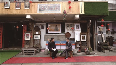 蒋元金(右)在红色藏品陈列室外接受记者采访