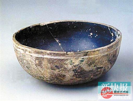 广东省广州市横枝岗出土。这是迄今中国出土最早的罗马玻璃器皿。此碗作深蓝紫色,模制成型,外壁及口沿经过打磨,口沿下的阴弦纹也是磨花,磨得不很规整,很像是地中海南岸的罗马玻璃中心公元前1世纪的产品。