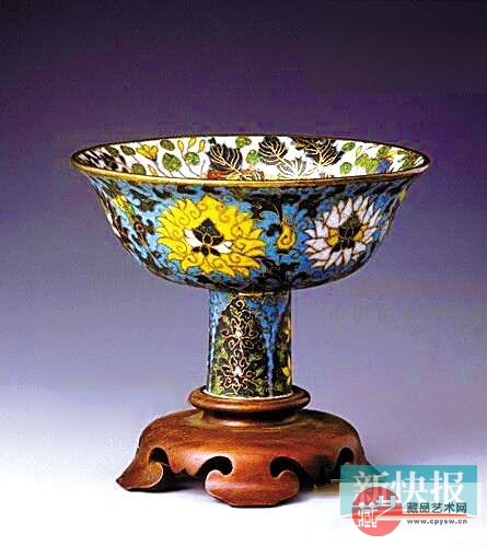这件珐琅器,撇口高足,配木制底座,碗内为白色地,饰以鱼藻纹,碗外为天蓝地,饰番莲纹。掐丝珐琅器,是在金属胎体上,用细铜丝铆焊成图案,加填各种珐琅彩釉料,经高温成色,最后磨光成器。这种工艺品的制作技术,在明代景泰年间(公元1450~1456年)日臻完善,成品多以蓝色为地,色泽晶莹,又被称为“景泰蓝”。