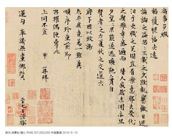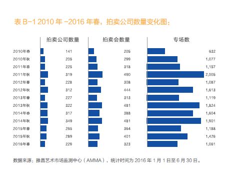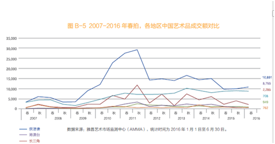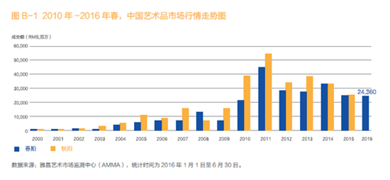 2016年7月21日,由雅昌艺术市场监测中心(AMMA)推出的《中国艺术品拍卖市场调查报告2016春》正式发布。据雅昌艺术市场监测中心(AMMA)不完全统计,截至2016年6月30日,2016年春拍中国艺术品拍卖市场总成交额为244亿元人民币,同比小幅下滑2.30%。在上拍量和成交量缩减的状况下,成交率同比提高10个百分点。