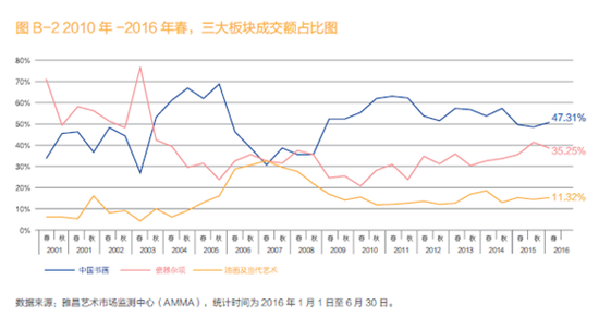2016 年春拍,中国书画、瓷杂、现当代艺术三大板块总成交额为228亿元,同比去年春拍下滑了1.19%。中国书画板块表现行情呈小幅反弹,其中表现最为出色的为古代书画。