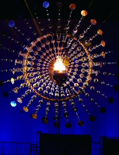 在里约奥运会开幕式上,美国艺术家安东尼·豪创作的动态装置,在风的动力下不断旋转并反射着圣火的光芒。