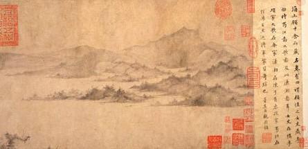南宋李氏《潇湘卧游图卷》,为与李公麟同乡的李姓画家所作。相传为南宋的云谷禅师云游四海之后,隐居于浙江吴兴的金斗山中。他不无遗憾地想到自 己尚未踏足的潇湘山水,于是请一位姓李的画家替他绘出潇湘美景,将画挂于房中,躺在床榻之上,就能欣赏美景,故为潇湘卧游。这幅画是乾隆皇帝最喜爱的山水 画,整幅长卷淡墨皴染一气呵成,不施勾勒,不露笔痕。大片的留白,朦胧的山水,山色空蒙,水到天际,大气磅礴,让观者一时笔法墨意尽忘,完全沉浸在画家营 造出来的那片广阔的境界之中,恍惚有神游天外的感觉,完全就是个神品。当年这幅画的价值甚至在《溪山行旅图》和《富春山居图》之上,清末为日本收藏家菊池 惺堂所得。1923年东京大地震,菊池家仓库着火,老头子冒着生命危险,从里面把最珍贵的《潇湘卧游图》和《寒食帖》抢救出来,于是两幅长卷上都留有一点 火痕,现在后者是台北故宫(微博)博物院的镇馆之宝。
