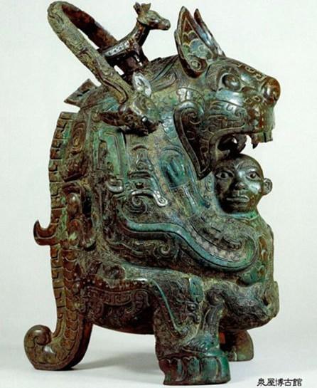 虎食人卣是中国商代晚期的青铜器珍品,也是日本藏中国青铜器中最重要的两件之一(另一件为永青文库的狩猎纹铜镜),通高35.7厘米,造型取踞 虎与人相抱的姿态,立意奇特。它和许多出土于湖南的商代后期的青铜器一样,纹饰繁缛,以人兽为主题,表现怪异的思想。这件作品究竟是要表现老虎吃人的凶 猛,还是人兽和谐的天人合一,历来说法不一,但可以确定的是,商代青铜器中很少有比这件更奇异复杂的了。