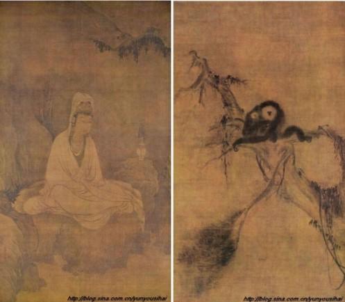 这套图画三幅一组,是宋代禅宗画的极品,藏于京都大德寺,每年十月的第二个周日展出一次。牧溪是南宋四川人,曾因反对贾似道而遭通缉。此人画法 极具禅意,每幅画皆随笔点墨而成,意思简当,不费装缀。最经典的《烟寺晚钟图》,就是几笔点就,简直就是神来之作。这组观音猿鹤图是著名的禅门公案图,这 除了观音之外,猿鹤的含义根本无从得知,特别是那只母猿,怀抱幼崽,情同人类,却又茫然直视,不知何解,仿佛画家用画笔画出了一幅充满禅机的问卷,让世人 回答。