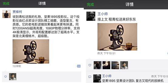 坚果1895为致敬电影,特别还原了老式电影放映机的造型,外观复古而有韵味,如同一件精致的收藏品。这样的特性,也让坚果1895一经推出就受到了影视圈的关注。坚果智能影院投资人、著名演员黄晓明先生在坚果1895上市之初就十分豪气地下单定制200多台专属铭牌机用以赠送给影视圈的朋友,其中也包括《芳华》、《天下无贼》等优秀电影的导演冯小刚。