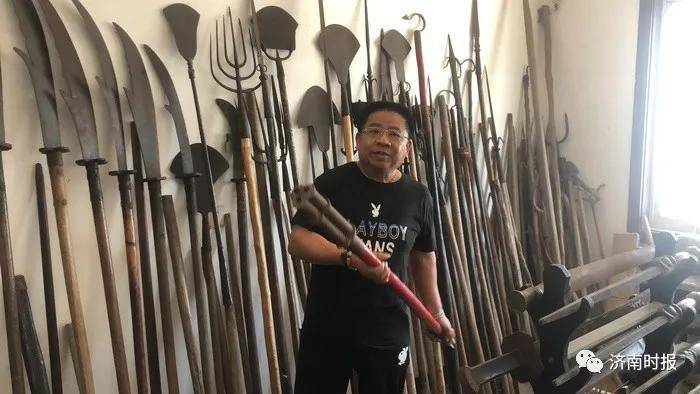 马方荣的收藏馆是一座带院子的三层小楼,各个房间里都“塞”满了藏品。马方荣已经说不清自己有多少藏品,只能用“大几万件吧”来粗略估计。二楼的一个房间是他的“兵器室”,摆放着不少冷兵器。“墙边立着一排长柄大刀,桌上放着的主要是刀剑,架子上是各类枪头。主要是明清时期的兵器,也有红军时期的大刀,刀柄上都有‘红军’字样。”一件件兵器的身世来历,马方荣如数家珍。