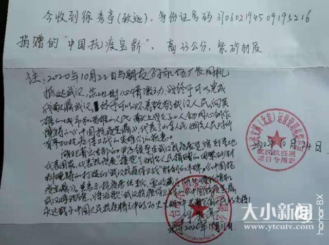 今年在全国支持武汉疫情防控阻击战正酣时,烟台晚报在3月14日的第5版,刊登了《烟台古稀老人携子制“宝鼎”赠武汉》的报道,引起了巨大的反响。日前,徐致远带着“中国抗疫宝鼎”飞抵武汉,将宝鼎圆满落户湖北省武汉市,被湖北省(武汉)博物馆永久珍藏,并在“抗疫”专题展览会上展出。