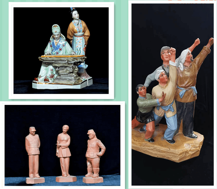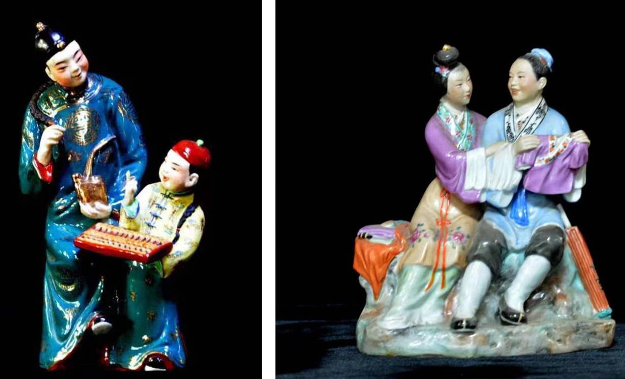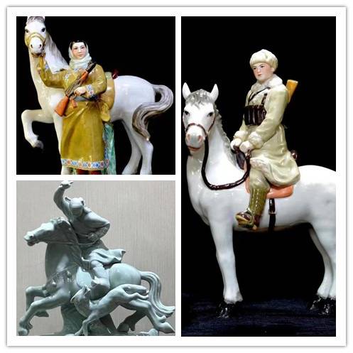 仔细观察戴老师的藏品,发现不少是建国后五十年代至八十年代景德镇各大瓷厂的艺术瓷,尤以人物雕塑名人名作更为多见,类似于《农奴愤》、《红灯记》、《沙家滨》、《白毛女》、《三岔口》、《红色娘子军》、《民族大团圆》、《草原英雄》、《铁骑》、《国庆花车》、《戍边卫国》、《西沙群岛》、《反美怒火》、《工农商学兵》等红色题材作品比比皆是;也有不少是以历史故事或传统文化为题材的,比如《将相和》、《鲁林会》、《花木兰》、《梁祝》、《梁红玉击鼓》、《牛郎与织女》、《黛玉和宝玉》、《白娘子和小青》、《济公》、《八仙过海》、《十八罗汉》、《天女散花》、《福䘵寿三星》等各式人物,举不胜举。