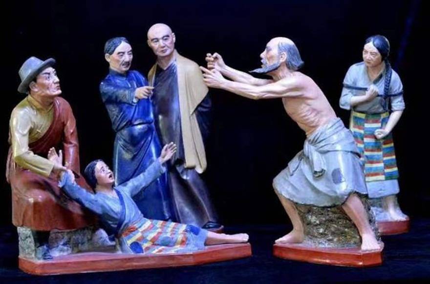 还有一组让戴老师津津乐道的得意之作,是一排乳白色大型组雕《收租院》,共64组、83个人物,系当年景德镇瓷雕瓷厂的工匠们参照1965年轰动一时的四川美术学院创作的大型泥塑《收租院》缩小比例而进行的瓷艺再创作。虽然,泥塑原作已在新中国雕塑史上举足轻重,誉满神州。但是,这组瓷雕作品同样融入了瓷雕大师们的无数心血和才智,又经过了恰到好处的窑火洗礼,其艺术美感丝毫不陆逊色甚至一定程度上还超越了原来的泥塑作品,故亦成为当之无愧的艺术瑰宝之一。