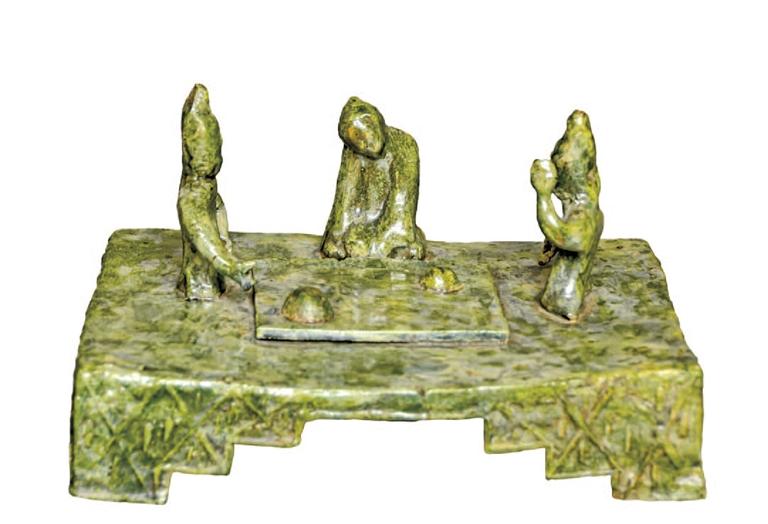 如果说黄河石是自然的馈赠,那汉绿釉器物便是匠心的结晶。这件汉代器物是韩丛礼的第一件“压箱底”珍品,通体呈现罕见的“麦青绿”色,浅绿如春日嫩草,鲜亮通透,与常见的深绿釉截然不同。“这种釉色在汉代极少见到,是窑变形成的精品,而且人物完整无残,太难得了。”说起藏品来历,韩丛礼记忆犹新。当时,他听闻陇西一位藏家手中有这件汉绿釉器物,便多次登门拜访。“跑了不下三次,每次都诚心交流,藏家被我的执着打动,才愿意割爱。”器物上,三位古人对弈围棋的场景栩栩如生:一人抬手落子,神色笃定;一人低头沉思,眉头微蹙;一人观棋,神态专注。“北京一位围棋大师偶然在我店里看到,来了好几次,出高价想买,我没舍得。”韩丛礼说,藏友们见了都赞叹“落子定胜负”,这名字也恰如其分地概括了器物的意境。如今,这件藏品已在他手中珍藏近二十年,从最初摆在店中供人观赏,到后来悉心收纳,只因“越看越喜欢,舍不得出手”。器物上的“麦青绿”釉色历经两千年依旧鲜亮,仿佛在诉说着汉代工匠的精湛技艺,也见证着韩丛礼对收藏的赤诚。