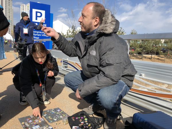 图为2018年2月11日路过的志愿者及工作人员在塞尔西奥-洛佩斯身旁挑选徽章。(参考消息网记者 任韬衡摄)
