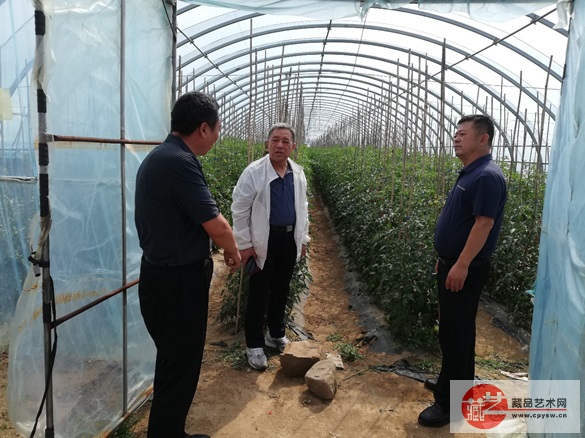 图为刘栋(左一)向中国退役军人就业创业促进会新农村发展服务专委会主任梁真兵(中)、河北省阳原县高墙乡乡长牛俊武(右一)蔬菜大棚发展情况。