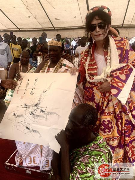 藏品艺术网全球艺术交流推广大使王杰克逊向桑维和克林贾博国王、纳南·阿蒙·恩杜福五世陛下赠送其创作的中国水墨画《虾》作品