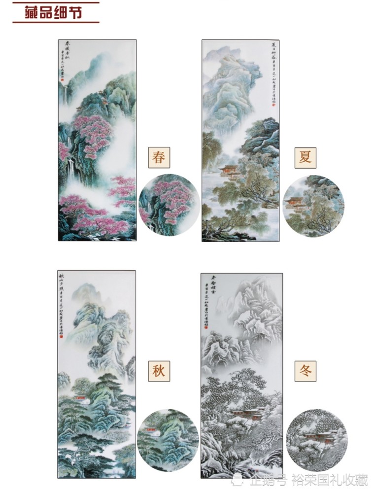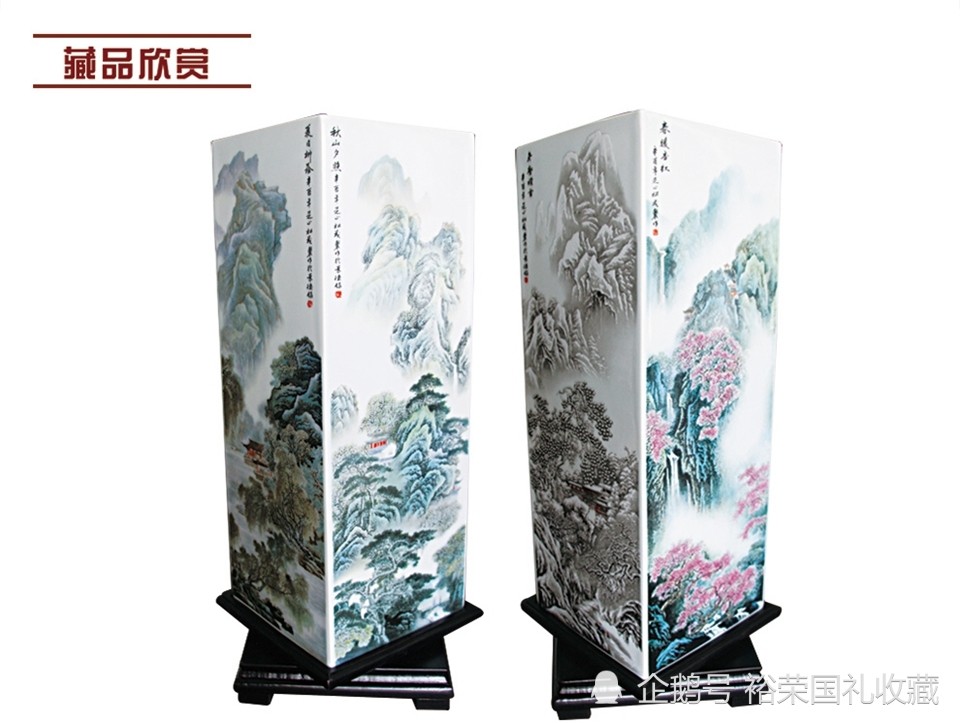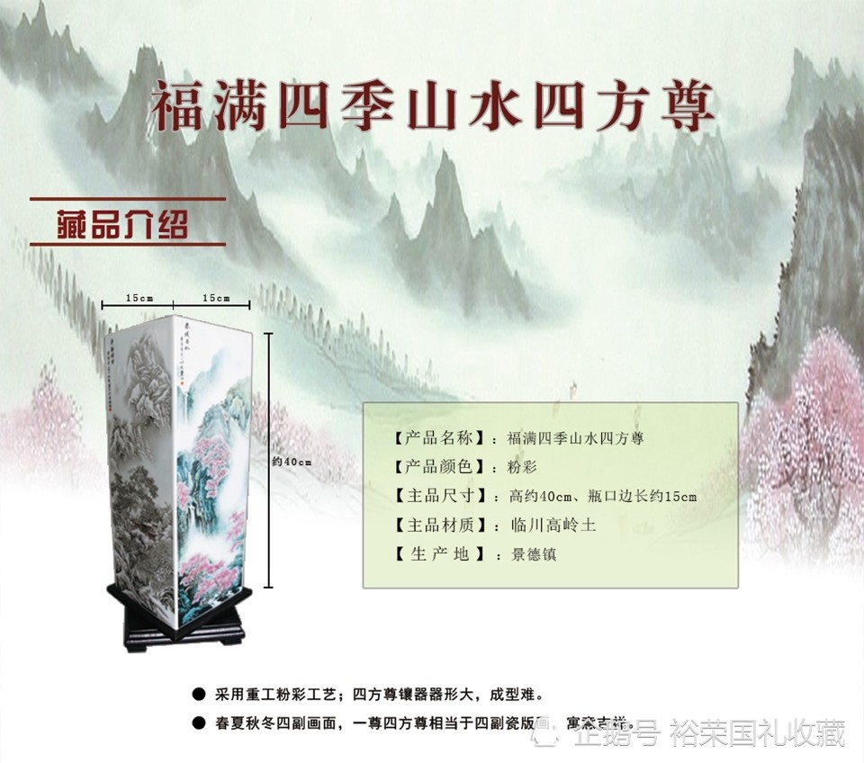 张松茂 瓷器《福满四季山水四方尊》,福满四季山水四方尊,一代陶瓷泰斗张松茂大师亲自创作,采用重工粉彩工艺,四方尊镶器器形大,成型难。春夏秋冬四副画面,一尊四方尊相当于四副瓷板画,寓意吉祥。 【藏品名称】:福满四季山水四方尊 【藏品颜色】:粉彩 【藏品尺寸】:高约40cm、瓶口边长约15cm 【藏品材质】:临川高岭土 【藏品产地】:景德镇 【创作大师】:张松茂