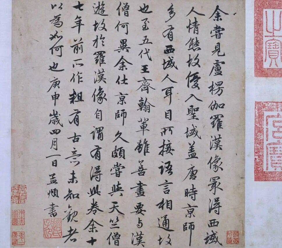 ¡¶ºìÒÂÂÞººÍ¼¡·Óֳơ¶ºìÒÂÎ÷Óòɮͼ¡·£¬ÀúÊ·ÉÏÔøÎªÇå¹¬ÖØÒª²ØÆ·¡£»ÉϽÇÇåÎúÁô´æ¡°Ç¬Â¡ÓùÀÀÖ®±¦¡±¡°ÈýÏ£Ìþ«¼øçô¡±µÈÆß·½Ç幬¼ø²ØÓ¡£¬ÕâЩӡÕ²»½öÊÇÇå´ú¹¬Í¢ÊղصĹٷ½Ó¡¼Ç£¬¸ü¼ûÖ¤ÁËÕâ·ù×÷Æ·ÔÚÇå´ú±»Ï¤Ðı£¹Ü¡¢ÖøÂ¼µÄÀú³Ì¡£¡¶ÇåºÓÊé»ô³¡·¡¶ÃصîÖéÁÖ¡·µÈÀú´úȨÍþµä¼®£¬¾ù¶ÔÆäÓÐÃ÷È·¼ÇÔØÓë¸ß¶ÈÆÀ¼Û£¬³ÆÆä¡°±Ê·¨×·½úÌÆ£¬ÉèÉ«¿ªÐ·硱£¬ÊÇÕÔÃÏî\ÒÕÊõÉúÑÄÖм«¾ß´ú±íÐÔµÄ×÷Æ·Ö®Ò»¡£