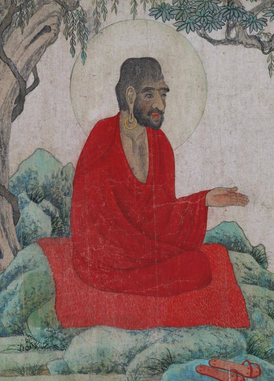 ÍÊÈ¥ÀúÊ·³¾°££¬¡¶ºìÒÂÂÞººÍ¼¡·µÄÒÕÊõϸ½ÚÓë´´×÷˼·ÇåÎú¿É±æ¡£»ÃæÖÐÑ룬ÆÐÌáÊ÷ϵÄÂÞººÉîÄ¿¸ß±Ç¡¢·ôÉ«÷îºÚ£¬¾ßÓÐÏÊÃ÷µÄÎ÷ÓòÈËÎïÌØÕ÷£¬Í·ºóµÊ©¹âÔÎÒÔ°µÊ¾Æä×Ú½ÌÉí·Ý£¬¼È·ûºÏ·ð»´´×÷µÄ´«Í³·¶Ê½£¬ÓÖÌåÏÖ³ö¶ÔÏÖʵÈËÎïµÄϸÖ¹۲졣ÂÞºº×óÊÖÆ½Éì×÷ ¡°Ëµ·¨½ÓÒý¡±×´£¬ÒÂÎÆÒÔ¡°ÌúÏßÃ衱¾«Ï¸¹´ÀÕ£¬ÏßÌõ¾¢Í¦ÈçÌúË¿£¬×ªÕÛ´¦ÀûÂäÓÐÁ¦£»ôÂôÄÔòÒÔÑóºìÓëÖìɰ²ã²ãÔÎȾ£¬É«ÔóºñÖØ³ÁÎÈÈ´²»ÄýÖÍ£¬Óë±³¾°ÖвԾ¢µÄ¹ÅÌÙ¡¢ÊæÕ¹µÄÆÐÌáÒ¶ÐγɸÕÈáÏà¼ÃµÄÊÓ¾õЧ¹û£¬¾¡ÏÔÔª´ú¹¤±Ê·ð»µÄ¾«Õ¿¼¼ÒÕ¡£