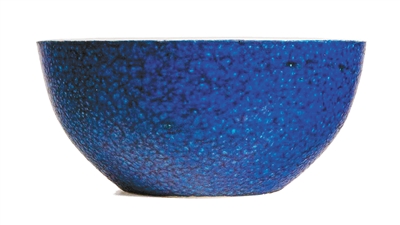 “雪花釉”原指“洒蓝釉”,为明宣德时景德镇所创。这种工艺是在烧成的白釉器上,以竹管蘸蓝釉汁水,吹于器表,形成厚薄不均、深浅不同的斑点,所余白釉地仿佛是飘落的雪花,隐露于蓝釉之中。与宣德时期相比,明弘治年间的雪花釉产品稍逊,近于藕荷色或青色,釉面亦欠匀净,色调深浅不一,但所制暗龙纹盘,里为白釉,外以青金蓝釉为地,龙身施淡孔雀绿彩,颇为精致。洒蓝釉在清康熙时最负盛名,以洒蓝描金装饰多见,与此同时,官窑中还出现了另一种“雪花釉”。这种“雪花釉”通常选用一种颜色为基色,然后掺杂其他釉色进行混合,或经过高温焰变,或经过物理作用而形成的一种含有缤纷雪花景象的釉色。这种“雪花釉”中最常见的是雪花蓝和雪花红,它们都是在蓝色或者红色中掺杂其他釉料而形成的。