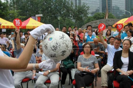 6月28日,北京东四奥林匹克社区举办第二届"慈善大集",为困难家庭献爱心,现场拍卖了10件藏品,还有20多个展卖台,众多市民参与。活动现场设置了拍卖和展卖两个部分,拍卖中有1992年国安队员签名的足球,书法作品等。本次慈善大集经过拍卖展卖等环节共得到近4万元的善款,随后将所有善款统一捐赠给北京慈善捐助中心。(来源:中新社 摄影:杜洋)