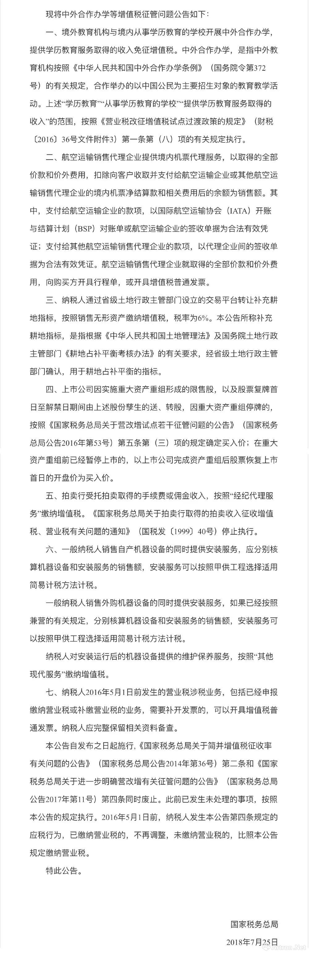 关于明确中外合作办学等若干增值税征管问题的公告