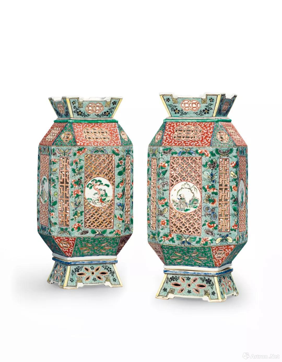 拍品编号1359 清康熙 五彩透雕开光人物故事图灯笼一对 高 28.6 cm.