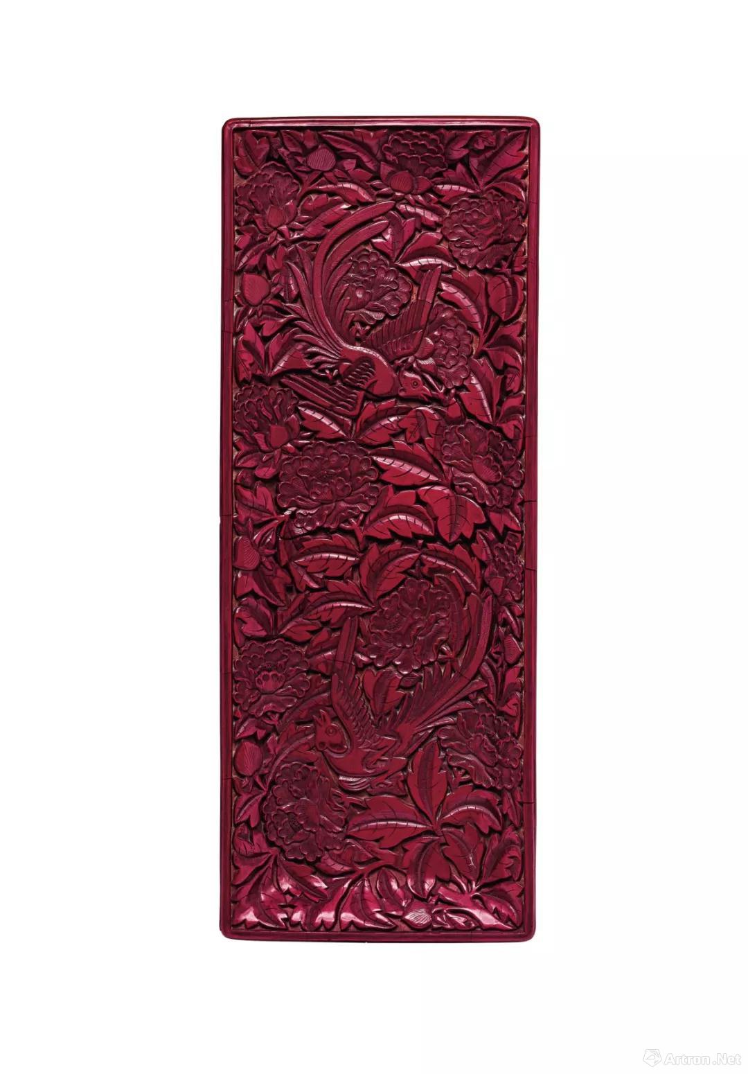 拍品编号1223 元十四世纪初 剔红锦鸡牡丹纹长方盘 长 36.7 cm.