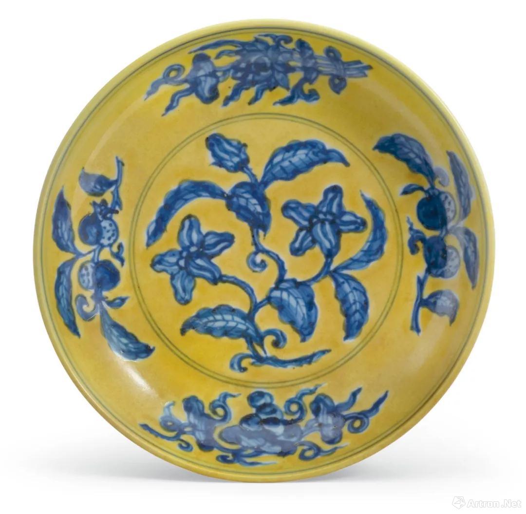 拍品编号1336 明正德 黄地青花栀子花纹盘 双圈六字楷书款 直径 19.7 cm.