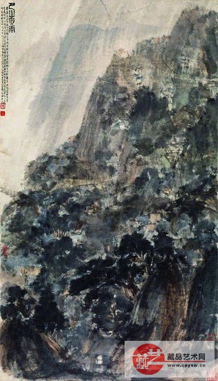 傅抱石创作饱含激情,以茶代酒,将“泉”“雨”充分结合起来, “皴水法”“破笔点”“扫雨法”等拿手绝活尽情展现,充分体现出傅氏画风的特色。