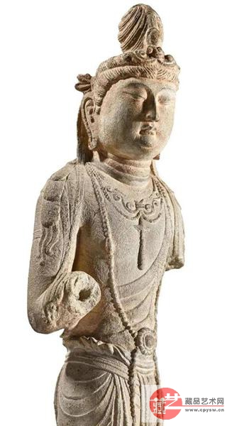 这尊“砂岩石雕菩萨像”也是这次拍卖会中,罕见的没有断代的菩萨像,但有文字说明其风格类似中国石窟造像,其中又以天龙山石窟最为接近。然而,在纽约苏富比在2007年拍卖图录中,曾确认这尊菩萨像是唐朝艺术,甚至注明出自天龙山石窟。纽约苏富比当时判定头部是盛唐时期所造,相关文章指其头部的艺术风格,与大都会艺术博物馆收藏的坐像头部非常接近,故推断同样来自天龙山21号石窟。