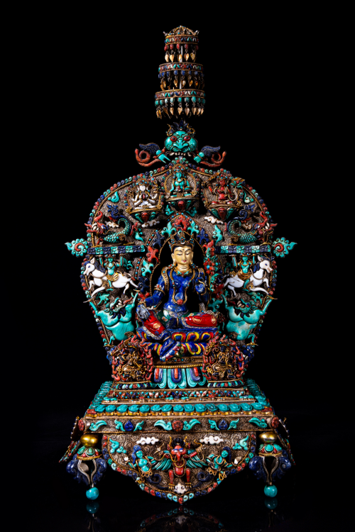 这是一座完整的“圣救度佛母”羯磨曼荼罗,立体、全方位的呈现了一座完整的佛母坛城。其上,佛家七宝俱全,颗颗手工制作镶嵌,体现了尼泊尔释迦族顶级工匠极高的工艺水平,除圣救度佛母主神法相外,日月、星辰、天眼、神鸟、六拏具、护法神......样样俱全,伽噌拏(大鹏金翅鸟)、布罗拏(华云鲸鱼)、那罗拏(华云龙子)、婆罗拏(华云童男)、舍罗拏(华云兽王)、救罗拿(华云象王)、吉祥天母、护法金刚等具在其上,意喻主神力大无穷,法力无边。