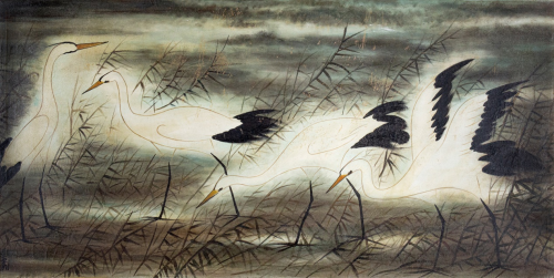 该幅作品67 × 135厘米,属林氏盛年后的巨幅油画,画面是黎明前的一群鹭鸶起舞嬉戏的情景,用油画的技法表现中国画的水墨线条和构图,把东方神韵和西方的构图和色彩高度融合,展现了作者淡泊无为、纯洁清净、对生命终极关怀的高尚情怀,属于林风眠中西融合的巅峰之作,堪称林风眠精品、绝品和孤品完美统一的大美之作。