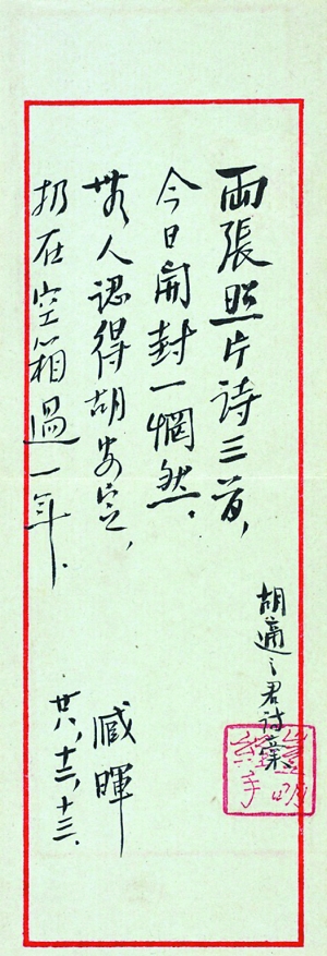 胡适致周作人信札一通 20世纪的中国,是在化解民族危机、经受战争考验、迎接革命洗礼的悲壮与豪迈中创造和书写着中华民族的现代史篇章。纵观中国历史中书法的生成及发展,有一条明确的主线,就是它生长于传统文人之中,依靠传统学问来滋养。 文人书法,其要素在于学人的人格理想、学识积淀、才华禀赋、精神境界的综合与升华。民国时期的一流学人康有为、梁启超、章太炎、胡适、辜鸿铭、周作人、郁达夫等举毕生心力沉潜为学,养就了书法之中那一重“文人之性质”、“文人之趣味”,以及书法之外那一重“文人之感想”的可贵品质。北京匡时2015年迎春拍卖会将于3月30日-31日举行,预展时间为3月28日-29日;迎春拍之际特推出“旧时明月:20世纪文人墨迹专题”,以期步踵前贤,勉力躬行。 (记者 徐磊 )