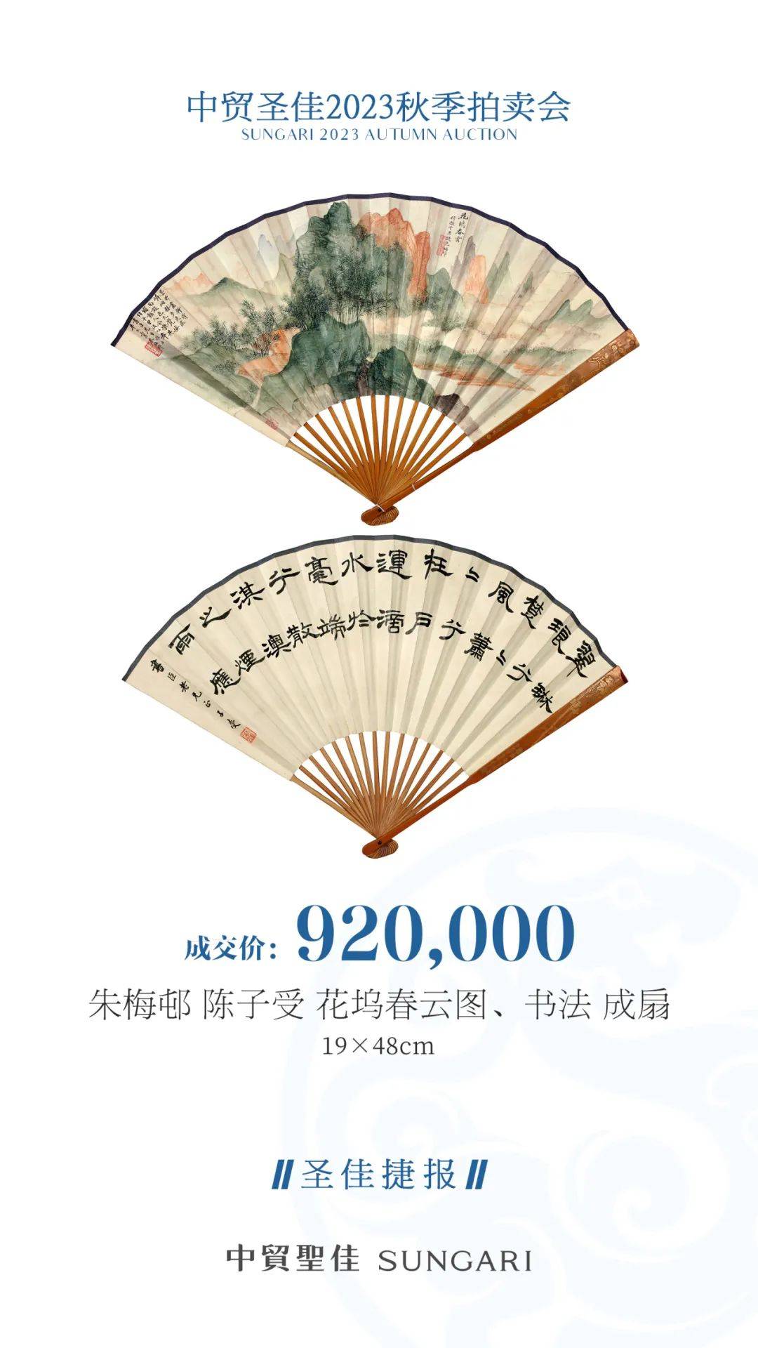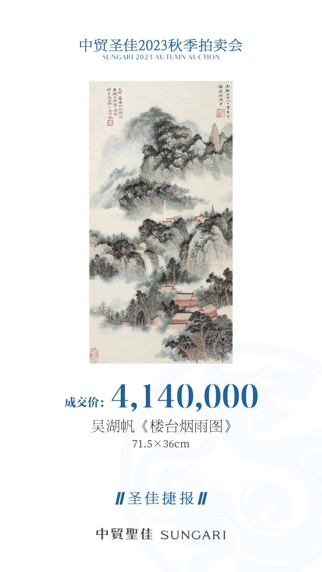 本季“共鉴—近现代书画”专场遴选265件书画精品,汇集梅景沉香、成扇专题,不乏数量重点来源清晰的名家家属释出拍品。质量上乘,估价亲民,受到新老买家热烈追捧。场上竞拍积极,成交踊跃,专场总成交48,222,950元。其中吴湖帆《楼台烟雨图》以414万元的成交价占据专场榜首。